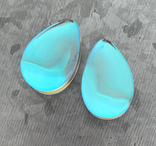 PAIR of Stunning Luminous Moonstone Iridescent Glass Teardrop Double Flare Plugs - Gauges 2g (6.5mm) thru 1"(25mm)