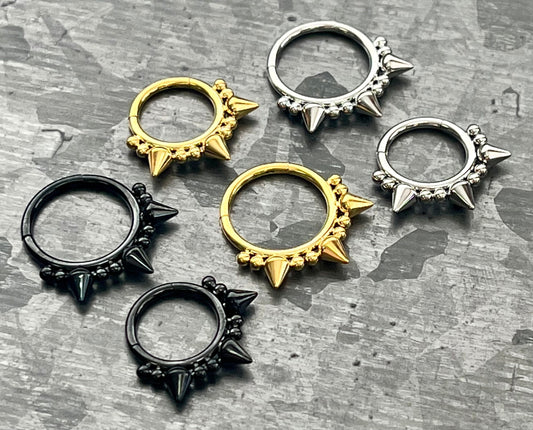 1 Piece Unique Three Spikes and Double Ball Steel Hinged Segment Septum Ring- 16g - 10mm or 8mm