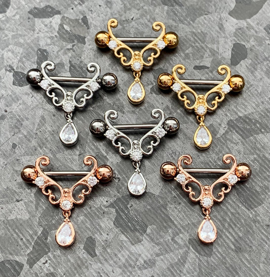 PAIR of Heart Filigree with CZ Teardrop Gem Steel Nipple Barbells/Shields/Rings