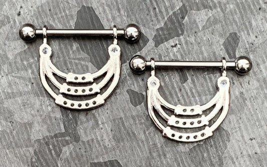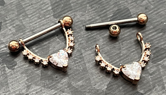PAIR of Lined CZ Gems w/ Heart CZ Gem Steel Dangle Nipple Barbells / Shield