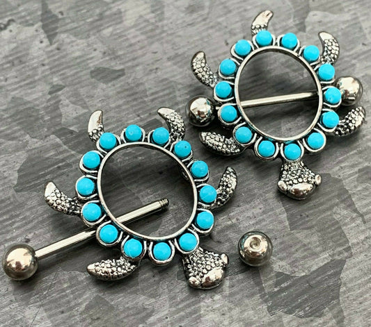 PAIR of Unique Teal Turtle Design Steel Nipple Barbells / Shields / Rings