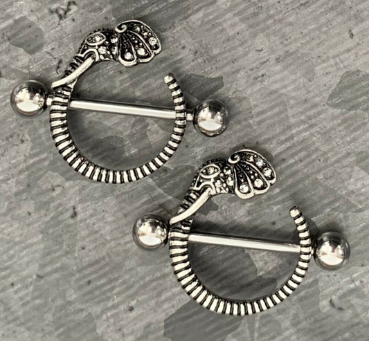 PAIR of CZ Gem Elephant Design Steel Nipple Barbells / Shields / Rings