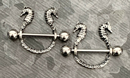 PAIR of Unique Seahorse Design Steel Nipple Barbells / Shields / Rings