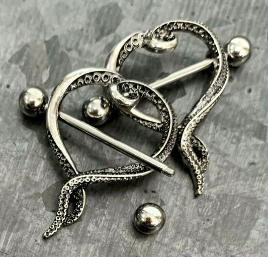 PAIR of Beautiful Heart Design with Tentacles Steel Nipple Barbells / Shields / Rings