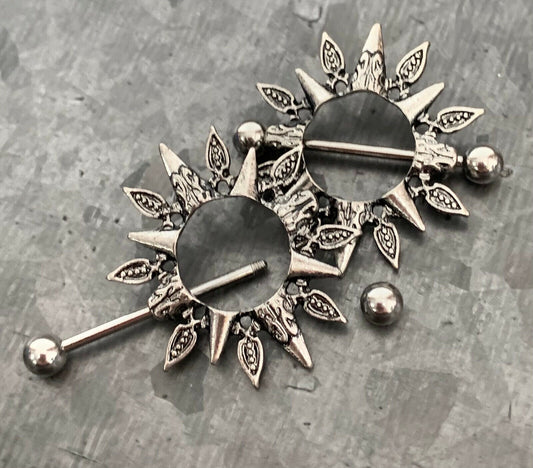 PAIR of Unique Tribal Sunburst Design Steel Nipple Barbell Shields