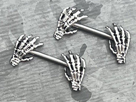 PAIR of Nipple Shields Skull Hand Ends Body Jewelry Surgical Steel Barbells Rings Skeleton