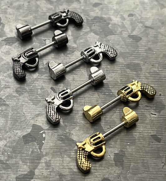 PAIR of Striking Revolver Pistol Gun Shaped Nipple Barbells/Rings