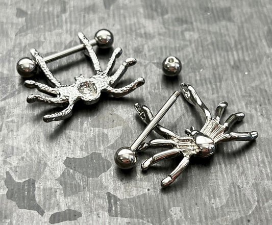 PAIR of Spooky Hanging Spider Steel Nipple Barbell/Shield/Rings