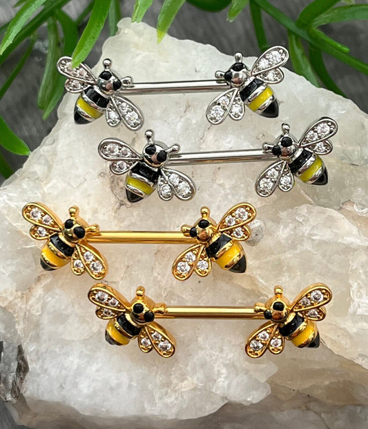 PAIR of Unique Bumblebee Nipple Rings with CZ Gem Bee Wings Steel Barbells