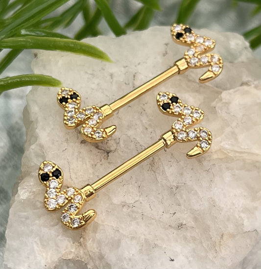 PAIR of Stunning CZ Gem Paved Snake Ends Nipple Barbells/Rings