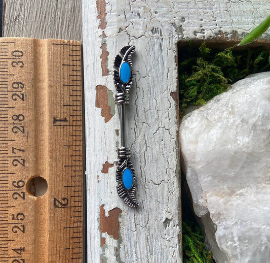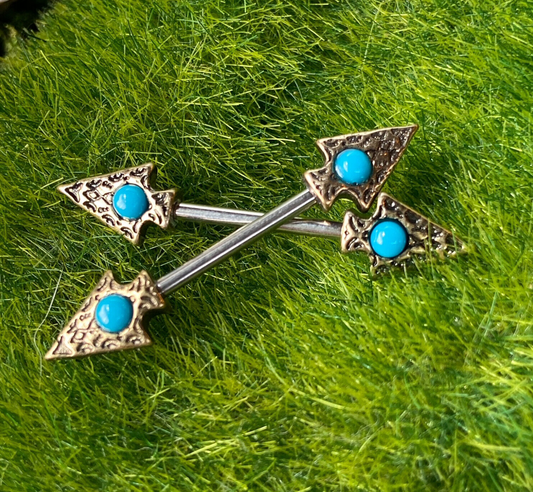 PAIR Tribal Spear w/ Turquoise Nipple Barbells Rings Body Jewelry 14g 14mm bar