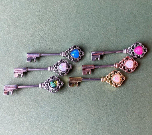 PAIR Opal Glitter Heart Vintage Key Nipple Rings Shield Barbells 14g 14 gauge