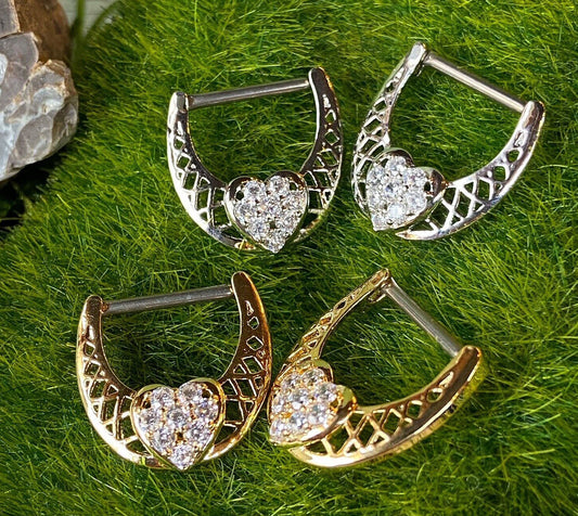 PAIR CZ Paved Heart Center Nipple Clickers Shields Rings Body Piercing Jewelry