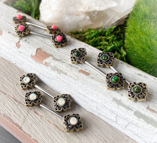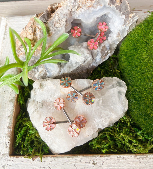 PAIR Opal Glitter Center Tribal Flower Nipple Rings Shield Barbells 14g 14 gauge