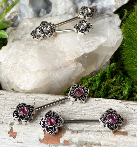 PAIR Gem Tribal Flower Nipple Rings Shields Barbells 14g Body Piercing Jewelry