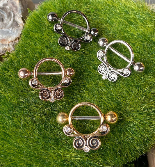 PAIR Lace Swirls w/Gems 316L Surgical Steel Nipple Shields Rings Body Jewelry