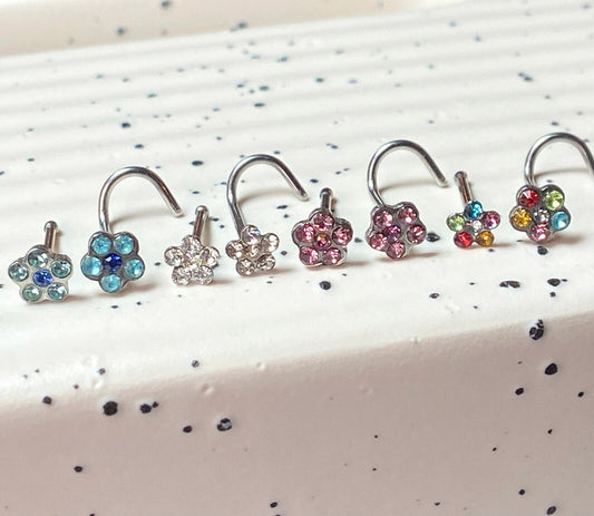 1pc Surgical Steel Nose Ring Gem Flower- choose color, 18g or 20g, Stud or Screw