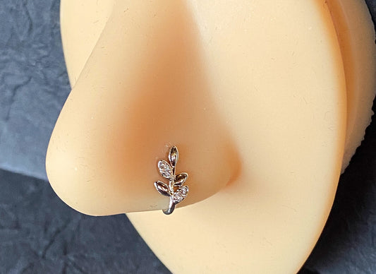 CZ Gem Olive Branch Non-Piercing Nose Clip, Faux Hoop Screw Stud Nostril Ring