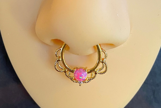 1pc NON-Pierced 14k Gold Plated Lacey Single Opal Septum Fake Clip-on Nose Ring