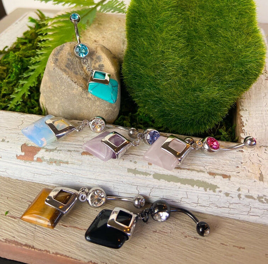 Diamond Shaped Semi-Precious Belly Ring Natural Stone Pierced Navel Naval 14g