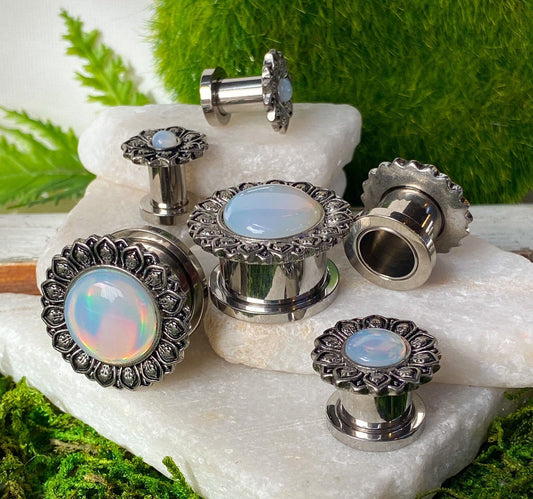PAIR Flower w/ Opalite Center Steel Screw Fit Tunnels Gauges Plugs Body Jewelry