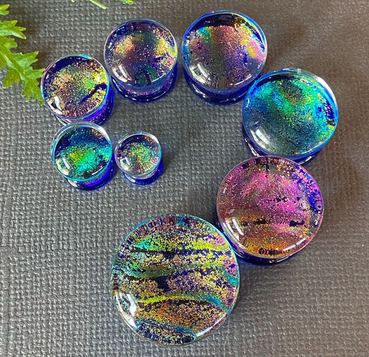 PAIR Blue & Purple Crackle Glass Plugs Double Flare Gauges Tunnels Body Jewelry
