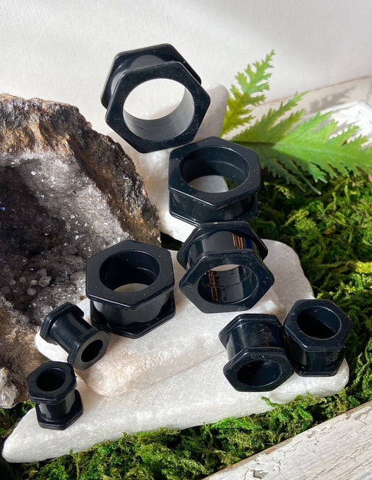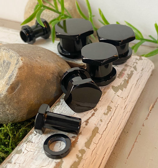 PAIR Black Hexagon Silicone Tunnels Double Flare Plug Earlet Gauges Body Jewelry