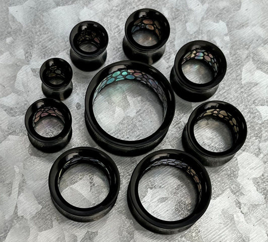 PAIR Inner Abalone-Look Pattern Inlaid Black Acrylic Saddle Tunnels Plugs Gauges