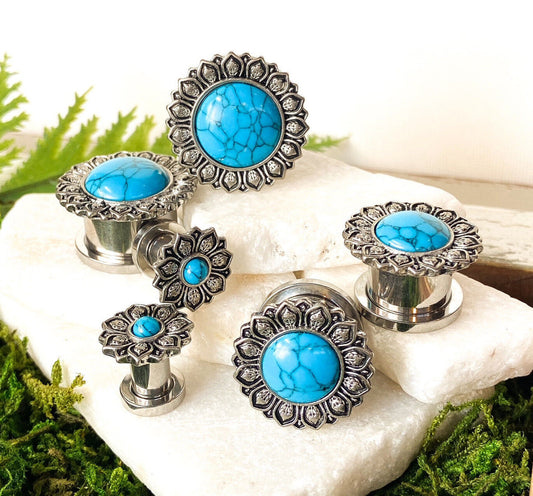 PAIR Flower w/ Turquoise Stone Center Steel Screw Fit Tunnels Gauges Plugs