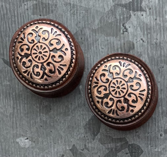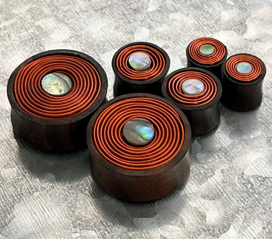 PAIR Sono Wood Plugs w/ Mother of Pearl Inlay & Copper Coil Earlets Gauges