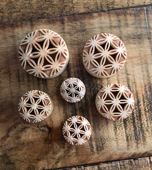 PAIR of Stunning Flower of Life Center Cut Out Blonde Crocodile Wood Saddle Plugs - Gauges 1/2" (12mm) up to 1" (25mm)