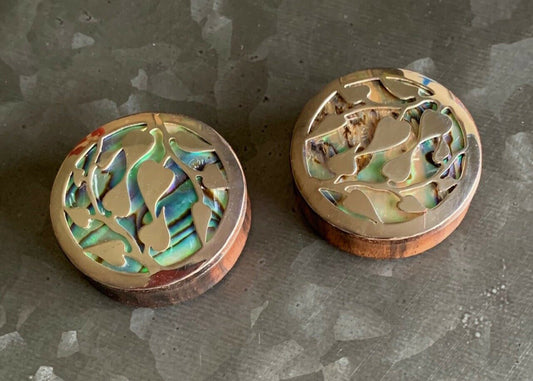 PAIR of Stunning Silver Leaves and Organic Abalone Shell Inlaid Sono Wood Saddle Plugs - Gauges 0000g (12mm) thru 1&3/8" (34mm)