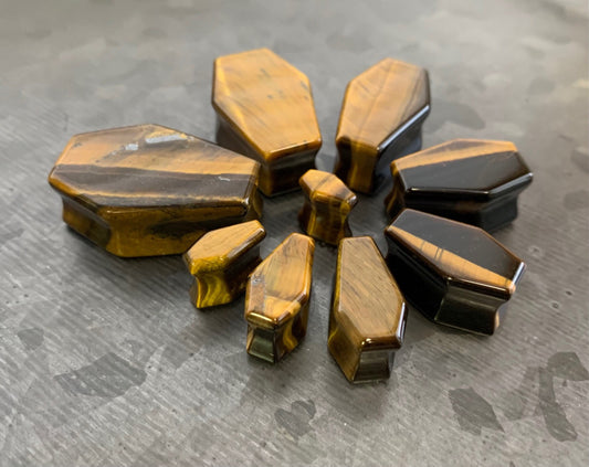 PAIR of Unique Coffin Shaped Organic Tiger Eye Double Flare Stone Plugs - Gauges 2g (6mm) to 1" (25mm)