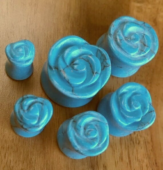 PAIR of Beautifully Carved Rose Flower Blue Turquoise Stone Double Flare Plugs