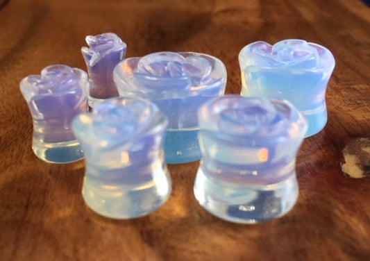 PAIR of Beautifully Carved Rose Flower Opalite Opalescent Stone Double Flare Plugs - Gauges 2g thru 5/8"