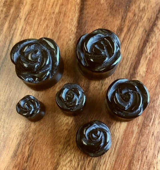 PAIR of Carved Organic Black Agate Stone Rose Flower Double Flare Plugs - Gauge 2g (6mm) thru 5/8" (16mm)!
