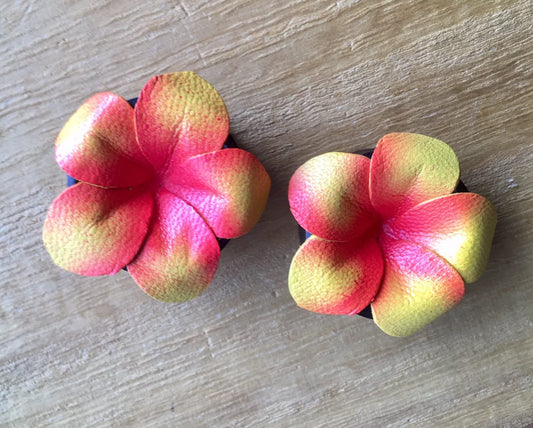 PAIR of Stunning Yellow / Pink Leather Flower & Bone Plugs - Gauges 0g (8mm) up to 15/16" (24mm)
