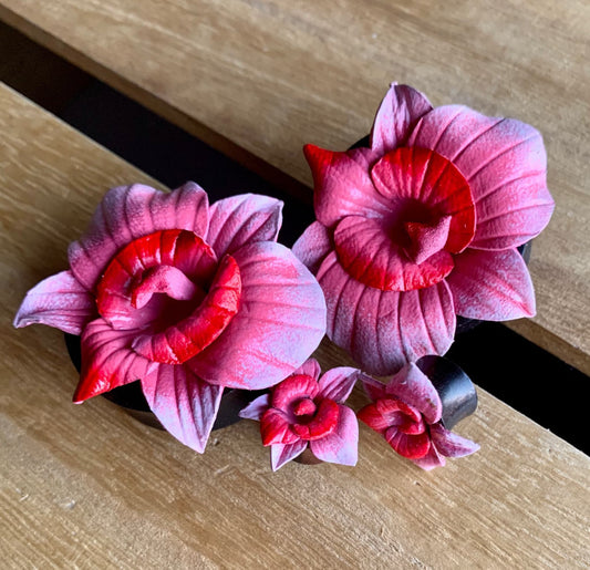 PAIR of Unique Pink Magnolia Leather Flower with Horn Plugs - Gauges 0g (8mm) up to 1&1/4" (32mm)