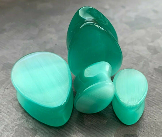 PAIR of Unique Sea Foam Green Cat Eye Stone Double Flare Teardrop Plugs - Gauges 2g (6mm) up to 1" (25mm)