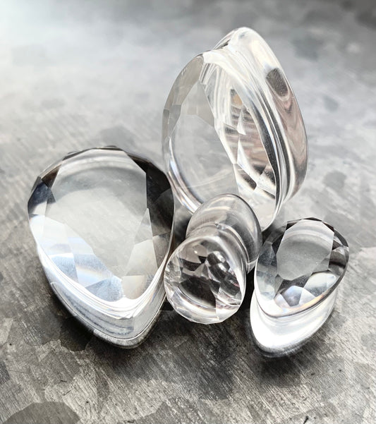 PAIR of Stunning Faceted Clear Glass Teardrop / Tear Drop Double Flare Plugs - Gauges 0g (8mm) up to 1" (25mm)