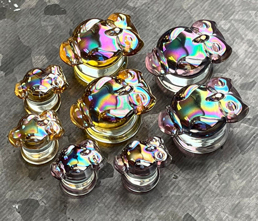 Pair of Stunning Aurora Borealis Owl Design Pyrex Glass Plugs - Gauges 2g (6mm) through 1" (25mm)