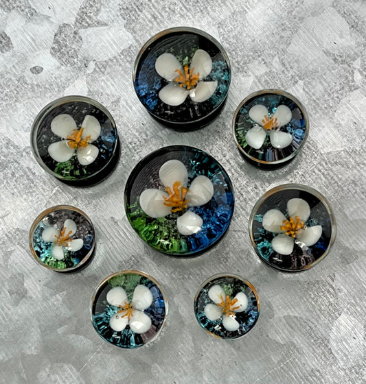PAIR of Unique Floating White Flower Pyrex Glass Double Flare Plugs - Gauges 0g (8mm) through 5/8" (16mm)