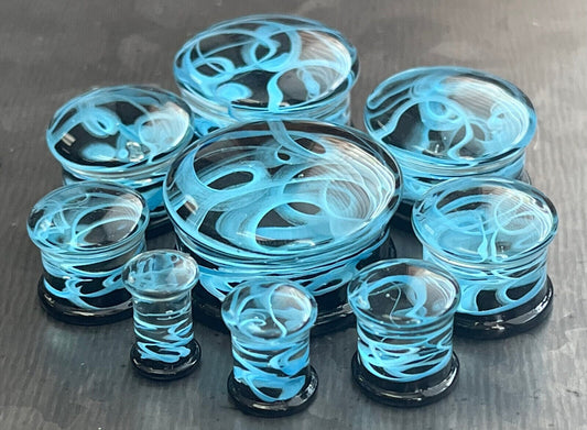 PAIR of Blue Swirling Smoke Style Pyrex Glass Double Flare Plugs - Gauges 2g (6mm) through 1" (25mm)