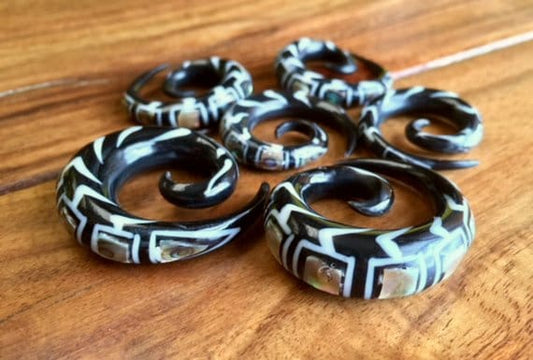 PAIR of Beautiful Organic Abalone Inlay Horn Spiral Tapers Plugs - Expander Gauges 2g,0g,00g