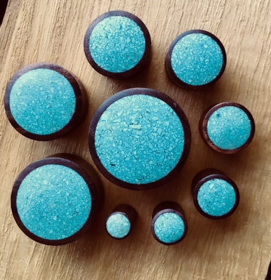 PAIR of Crushed Turquoise Inlaid Wood Saddle Plugs Tunnels Gauges Body Jewelry