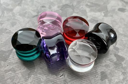 PAIR of Stunning Faceted Glass Double Flare Plugs - Black, Clear, Pink, Red, Purple and Teal