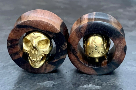 PAIR of Unique Brass Skull Organic Ebony Double Flare Wood Tunnels/Plugs - Gauges 9/16" (14mm) up to 1" (25mm)