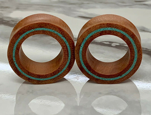 PAIR of Unique Crushed Turquoise Rim Inlay Sawo Wood Tunnels/Plugs - Gauges 0g (8mm) thru 1" (25mm)