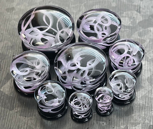 PAIR of Purple Swirling Smoke Style Pyrex Glass Double Flare Plugs - Gauges 2g (6mm) through 1" (25mm)