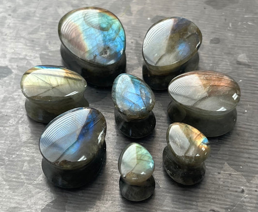 PAIR of Beautiful AAA Grade Labradorite Teardrop Natural Stone Double Flare Plugs Tunnels Gauges Body Jewelry
